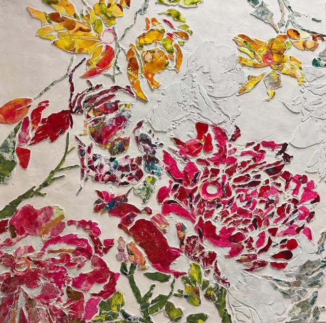 features bold, expressive floral compositions layered with heavy texture—each piece a