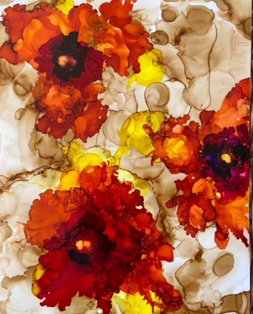 working primarily in acrylics, mixed media, collage, and alcohol inks. Her signature style